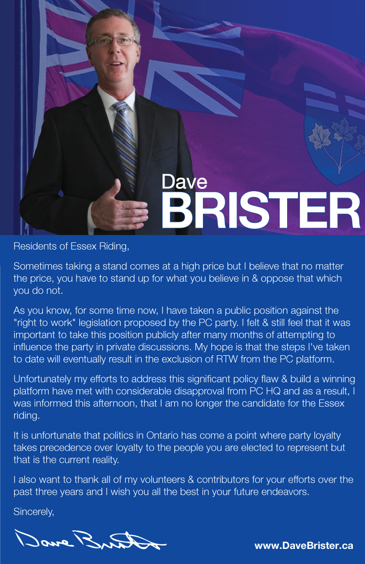 "Dave Brister fired as PC candidate in Essex" - Windsor Star